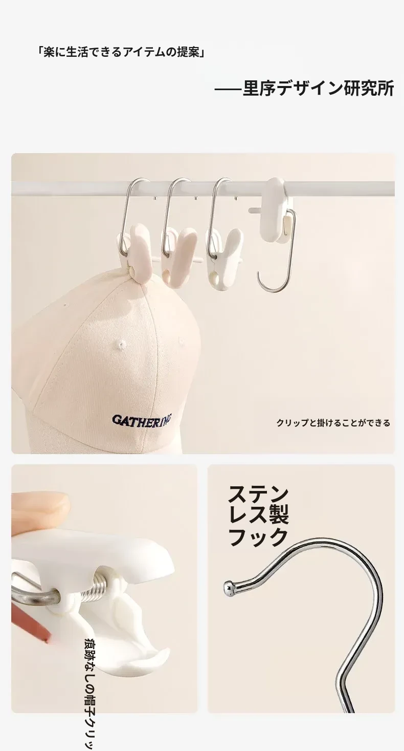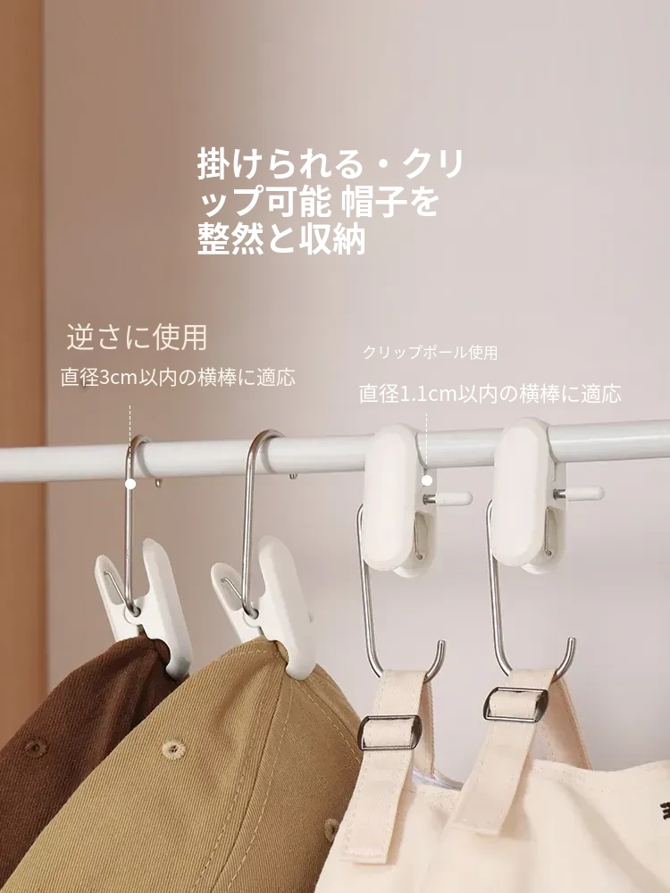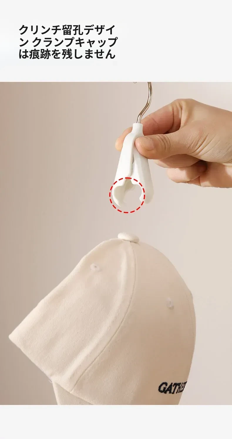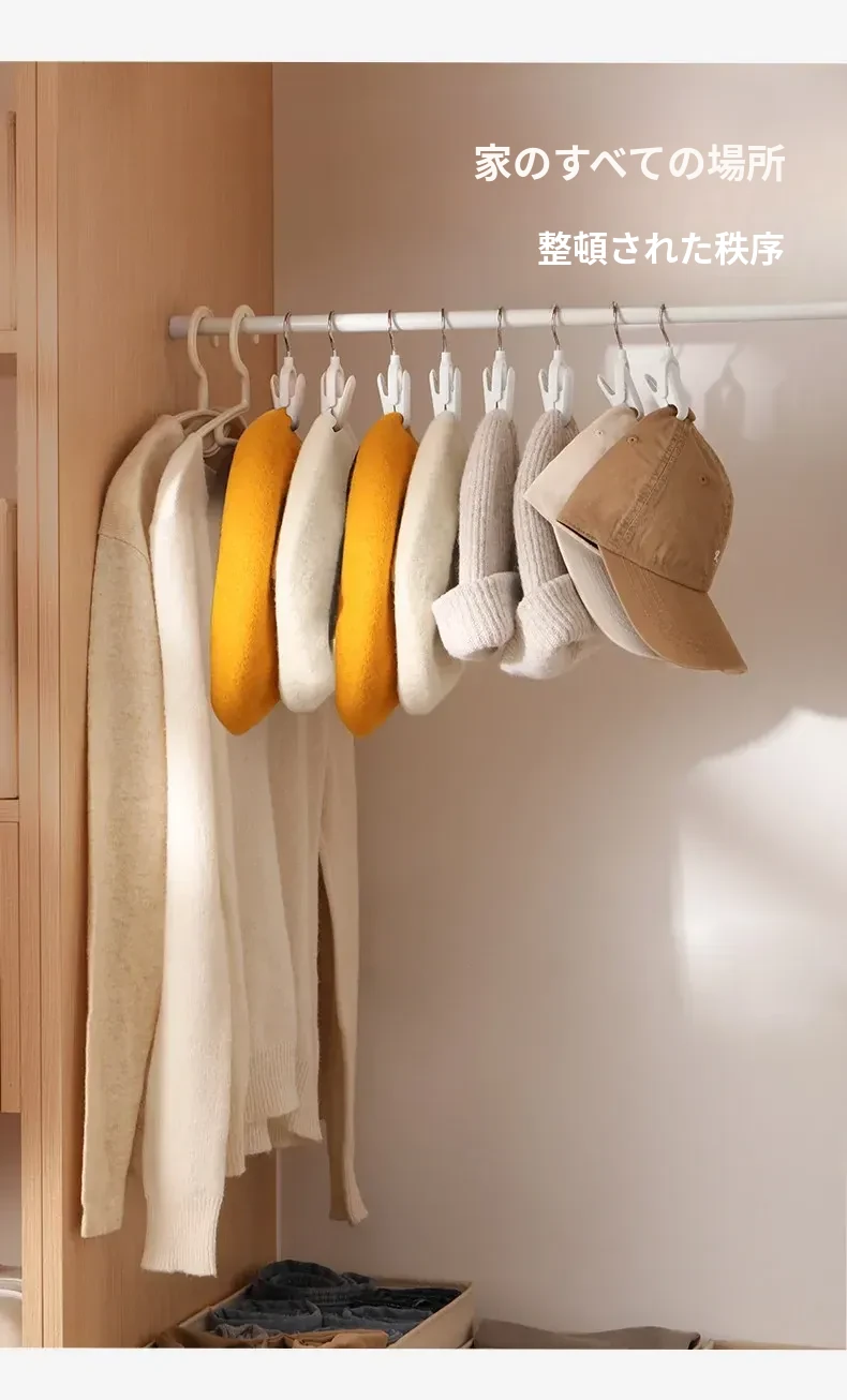 帽子収納マジックフック|家庭用・玄関・寮・クローゼットに最適!吊り下げ整理・回転式・跡が残らないクリップ付きハンガーで、スッキリおしゃれに帽子を収納!