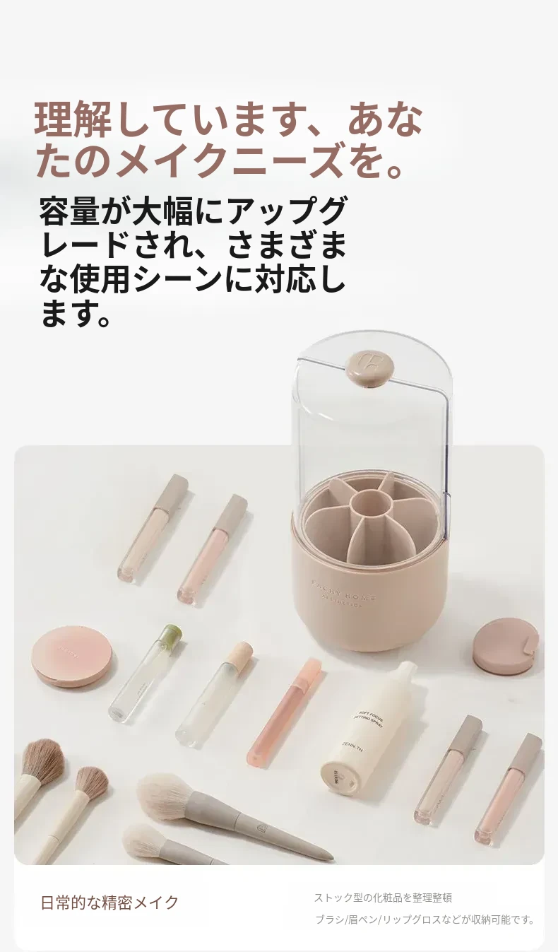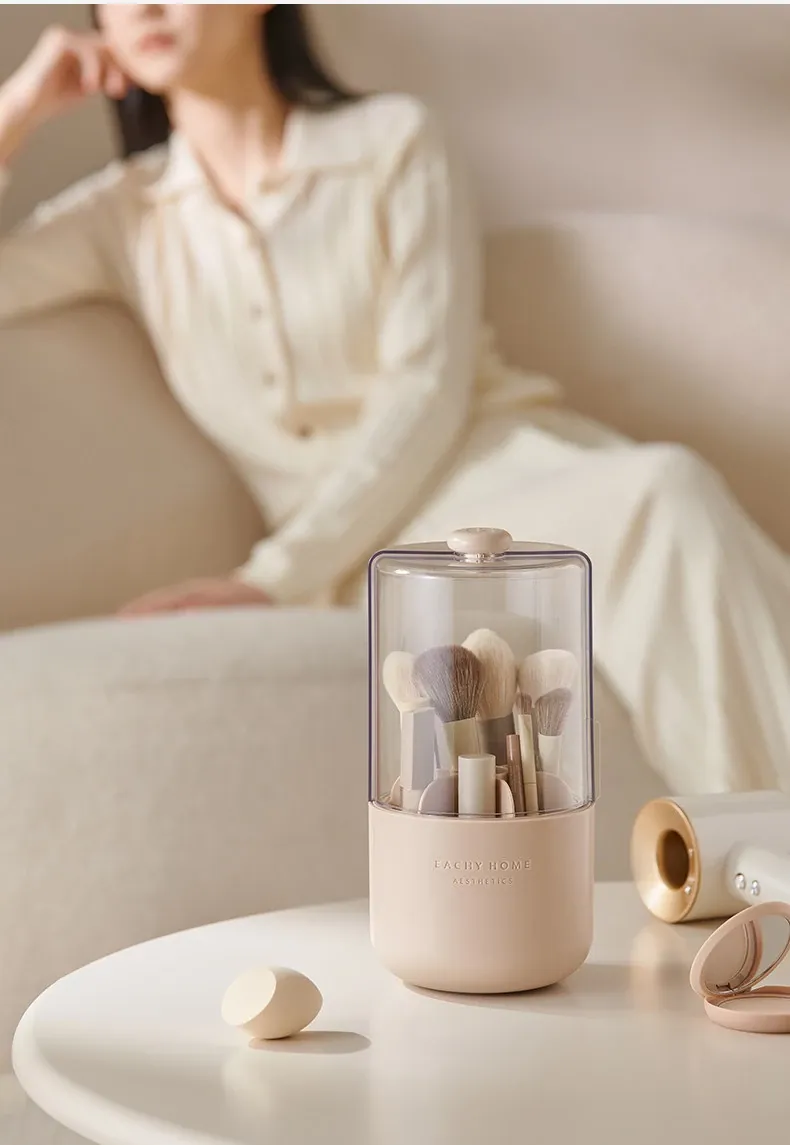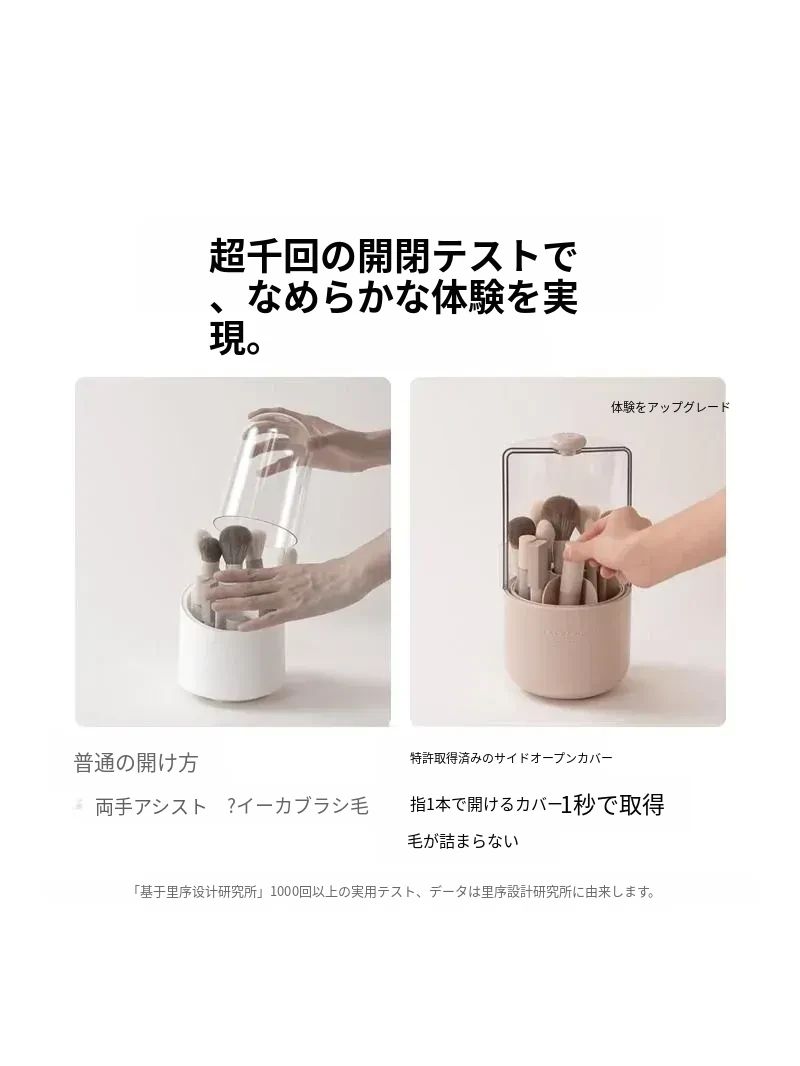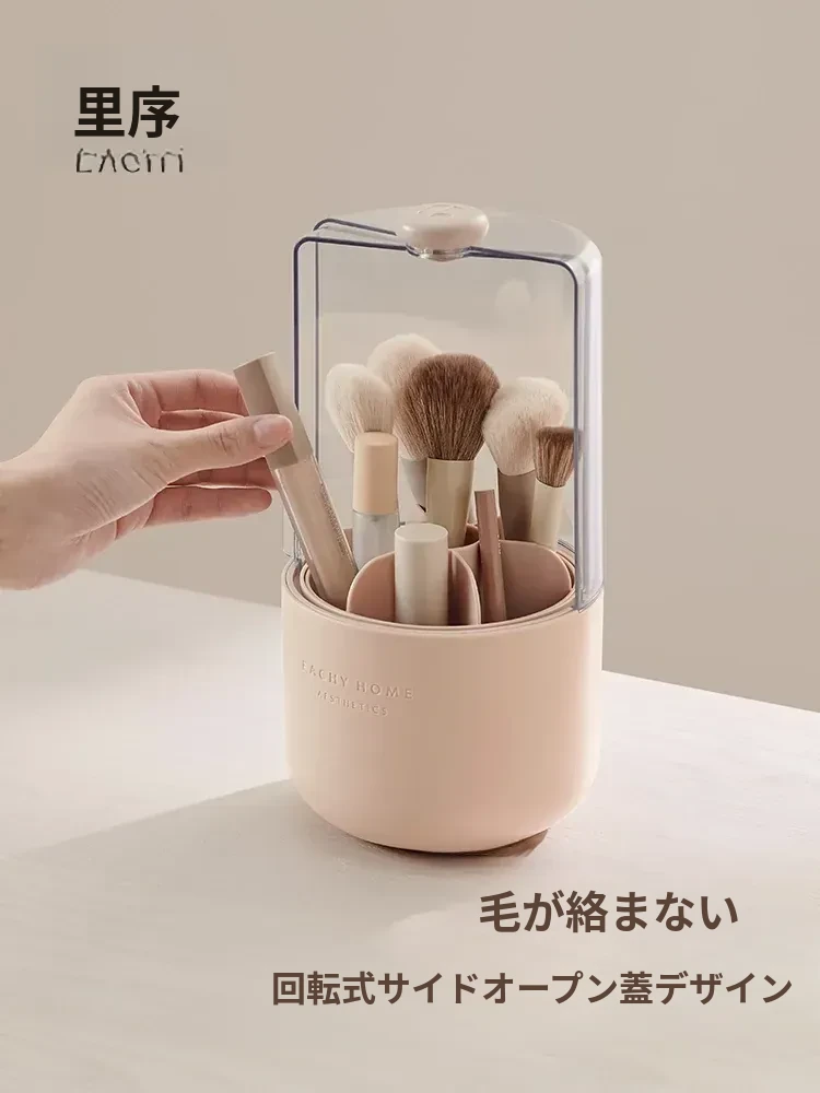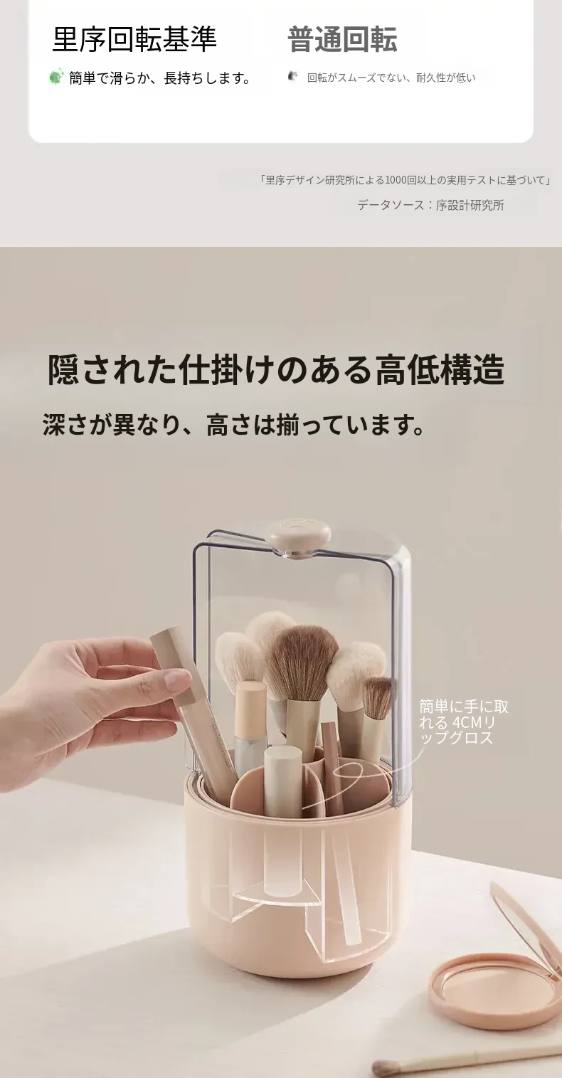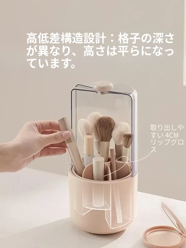 スタイリッシュなメイクブラシ収納ボックス - 防塵カバー付きで、デスクを美しく整理整頓!回転式で使いやすく、化粧品をすっきり収納。あなたのメイクアップをさらに楽しく!